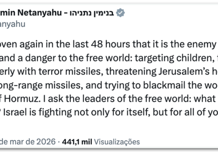 Israel atacará pessoalmente cada líder do Irã, diz Netanyahu 2 min read Geral Israel atacará pessoalmente cada líder do Irã, diz Netanyahu RealRadioTvBrasil março 22, 2026