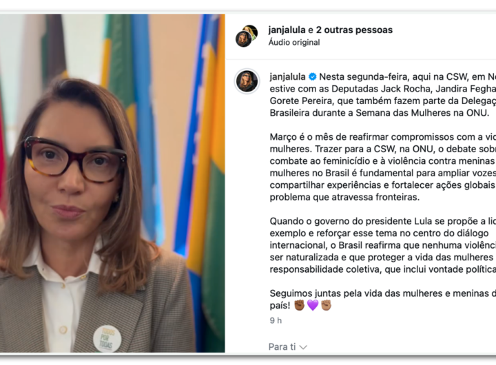 Janja publica vídeos de evento da ONU sobre mulheres 3 min read Geral Janja publica vídeos de evento da ONU sobre mulheres RealRadioTvBrasil março 10, 2026