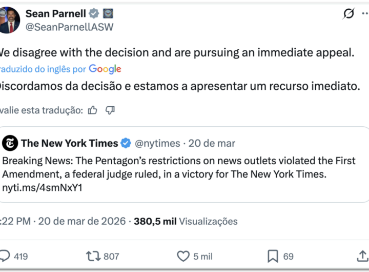 Justiça dos EUA derruba política do Pentágono sobre jornalistas 2 min read Geral Justiça dos EUA derruba política do Pentágono sobre jornalistas RealRadioTvBrasil março 22, 2026