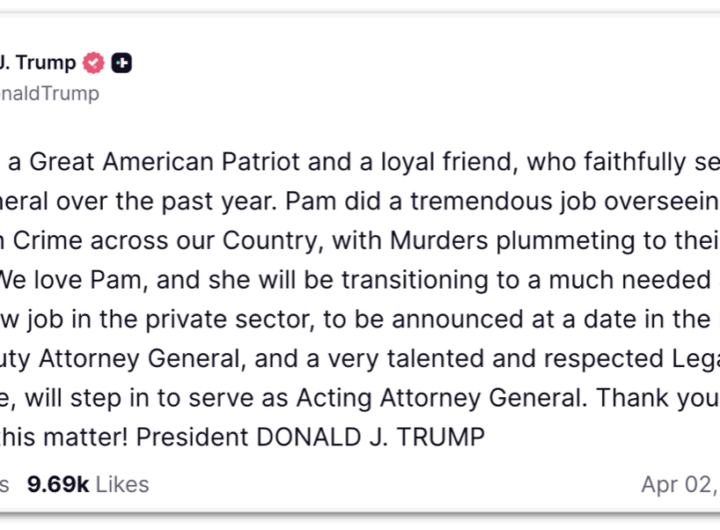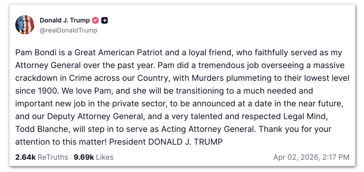 Trump demite Pam Bondi, procuradora-geral dos Estados Unidos 2 min read Geral Trump demite Pam Bondi, procuradora-geral dos Estados Unidos RealRadioTvBrasil abril 2, 2026