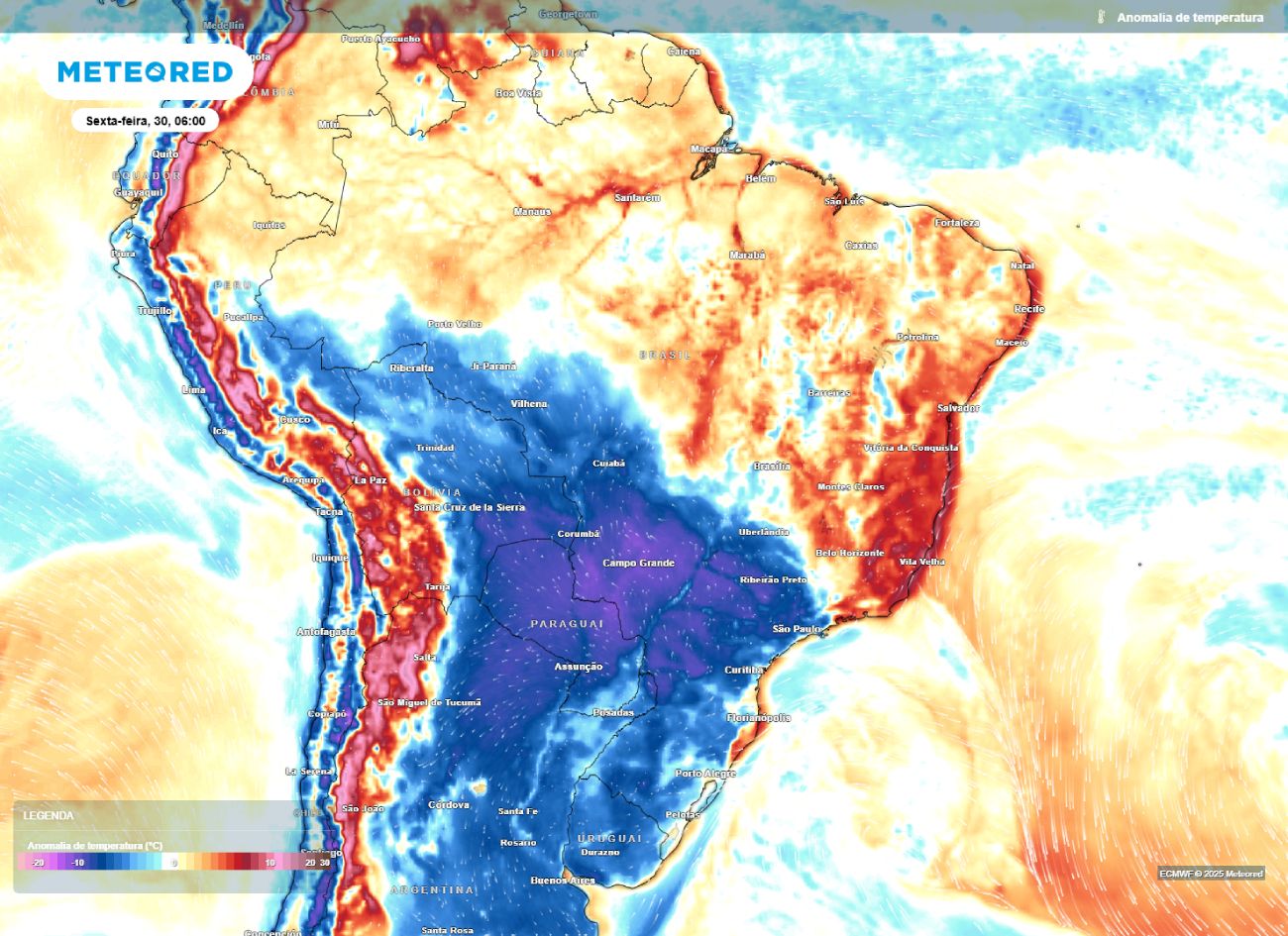 A massa de ar polar também vai diminuir as temperaturas no Sudeste, Centro-Oeste e Norte do Brasil. Na capital Campo Grande/MS a mínima prevista nesta sexta-feira (30) é de apenas 7°C e de 6°C em Dourados/MS.