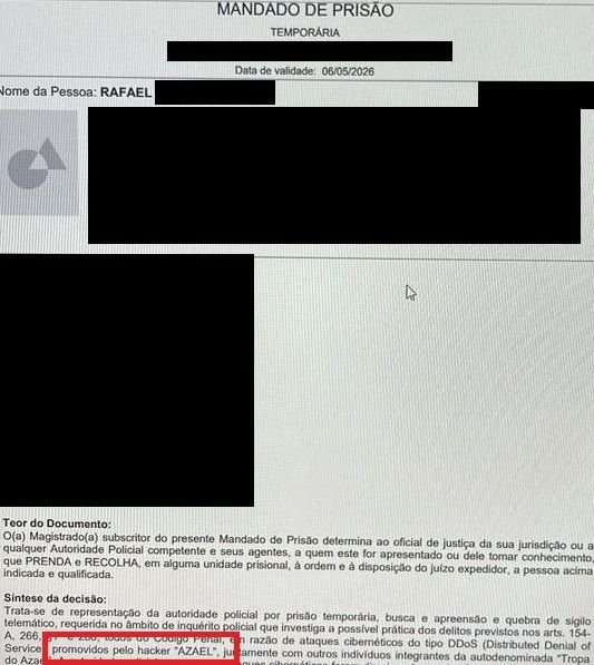 O TecMundo recebeu com exclusividade a imagem de um suposto mandado de prisão para “Rafael B.”, nascido em 1990 e identificado como “hacker Azael” no mesmo. Além disso, o mandado nota que Rafael atuaria ao lado de outras pessoas, que seriam integrantes da “Tropa do Azael”.