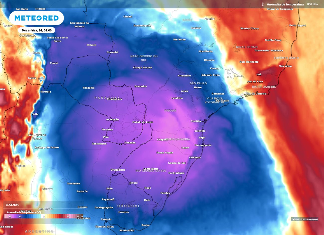 A terça-feira (24) vai ser gelada desde as primeiras horas da madrugada. O rápido avanço da potente massa de ar polar vai provocar queda acentuada nas temperaturas a partir da noite de hoje (23). Durante a madrugada já são esperadas temperaturas negativas sobre a região de serra, em Santa Catarina e Rio Grande do Sul.