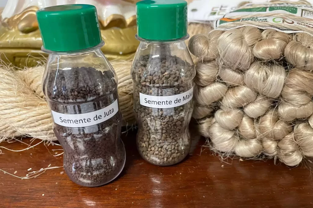 No caso da juta e malva, provenientes da agricultura familiar, as fibras vegetais são usadas na confecção de adereços, artesanato e, ainda, nas fantasias e alegorias dos bumbás.
