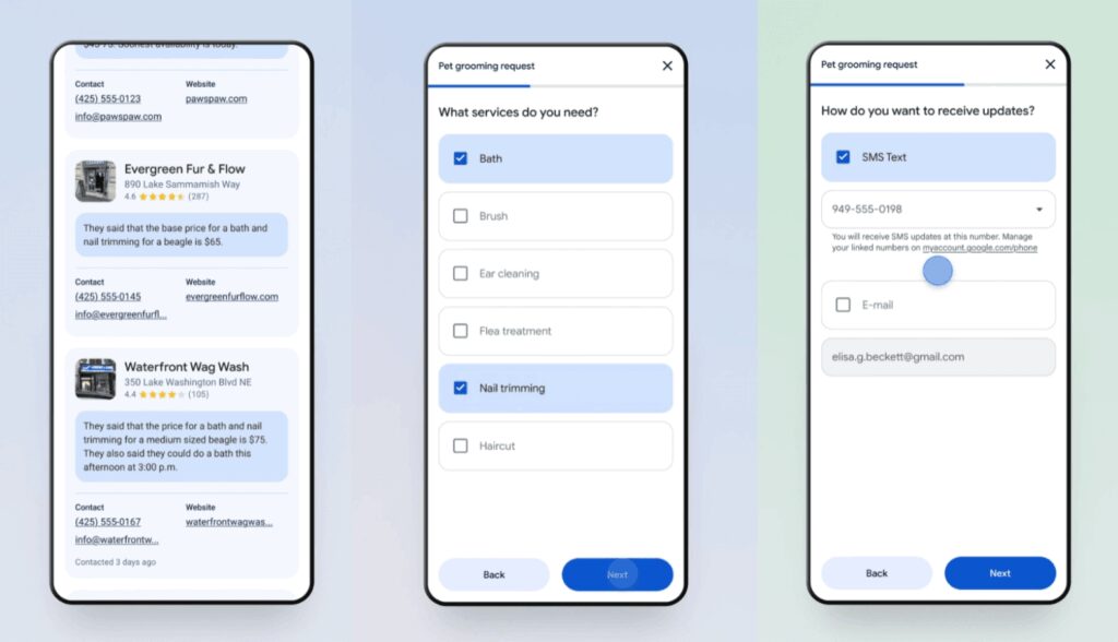- Lá, o Google fará perguntas sobre o tipo de serviço solicitado e como o cliente deseja ser notificado.