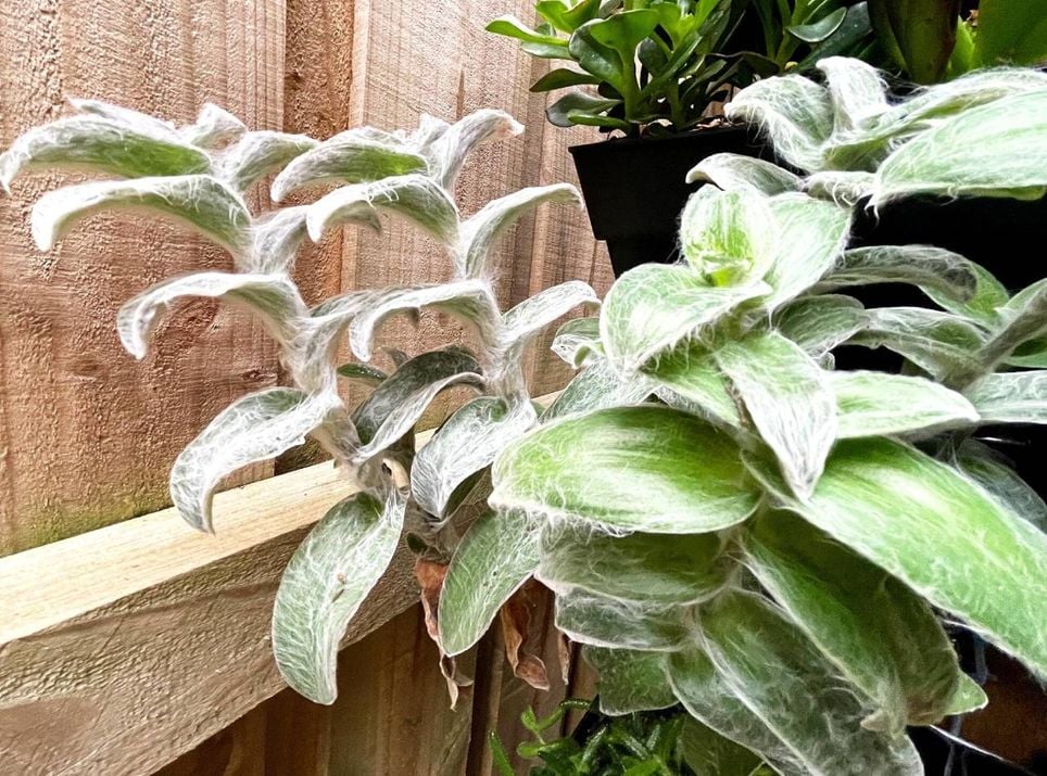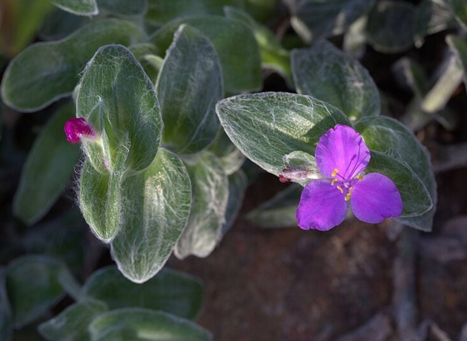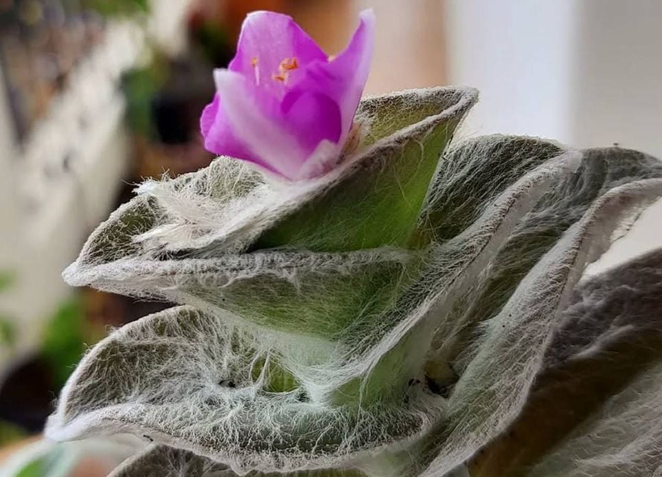 A planta de aparência exótica, também conhecida como trapoeraba-aveludada ou coração-peludo, possui uma fina camada de fiapos brancos (chamados tricomas) que auxilia na retenção de umidade, evitando a perda excessiva de água por evaporação, tornando assim a planta altamente resistente à seca.