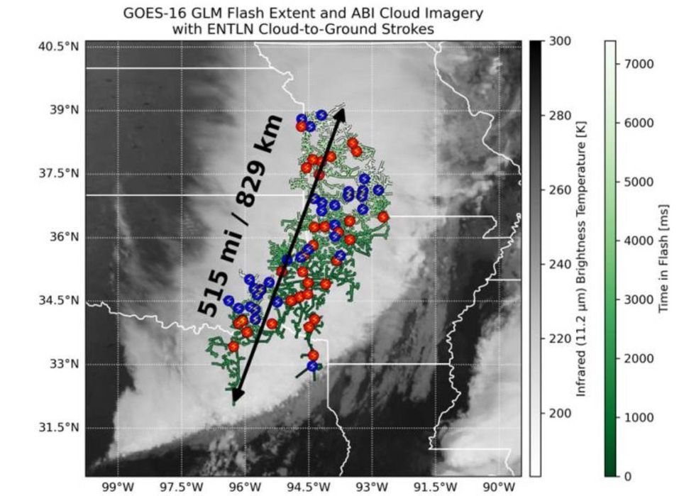 A descarga elétrica aconteceu durante um grande complexo de tempestades que cruzou o céu entre o leste do estado do Texas e a região de Kansas City, no estado do Missouri, em 22 de outubro de 2017. Há uma margem de erro de ± 8 km neste novo recorde.