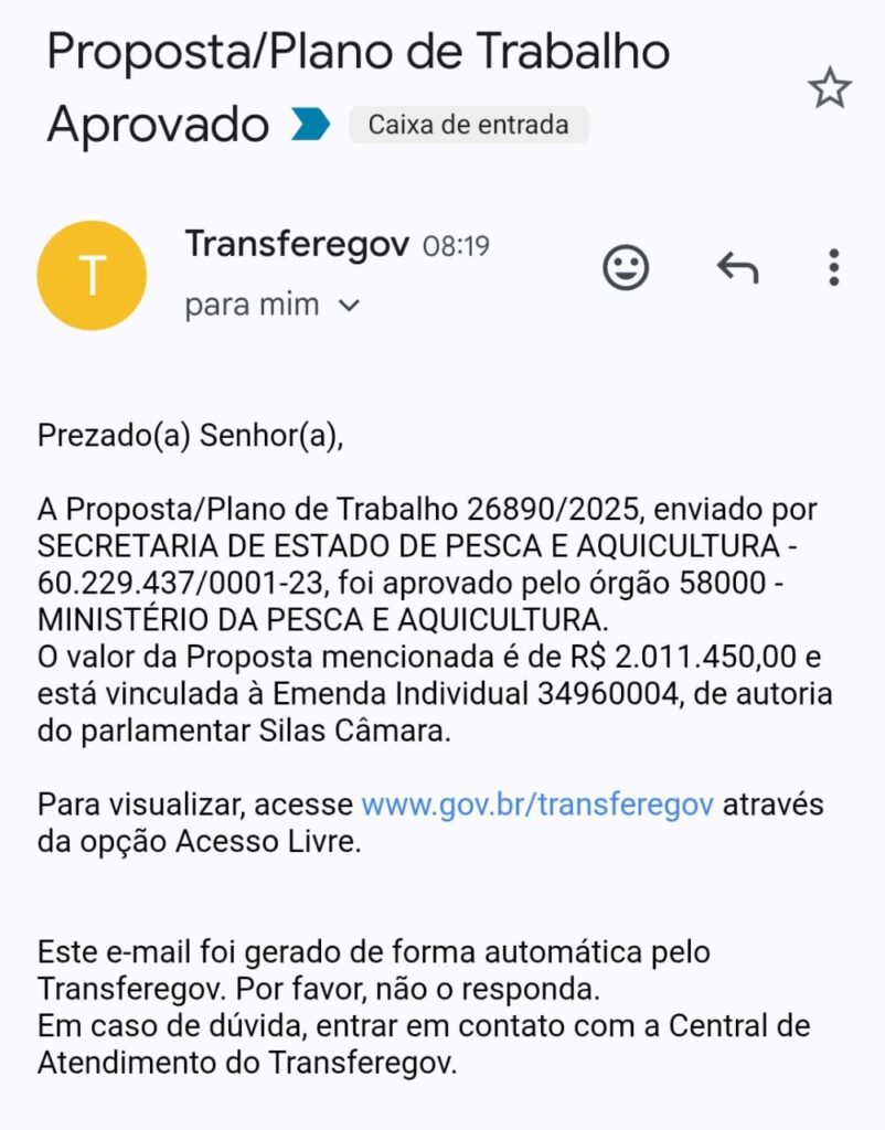 “Na oportunidade será anunciada oficialmente mais uma emenda já aprovada com o plano de trabalho para a Sepa 26890/2025, junto ao Ministério da Pesca e Aquicultura (MPA), no valor de mais de R$ 2 milhões, feita pelo Deputado Silas Câmara, o que já soma R$ 4 milhões em 2024”, antecipou o secretário.