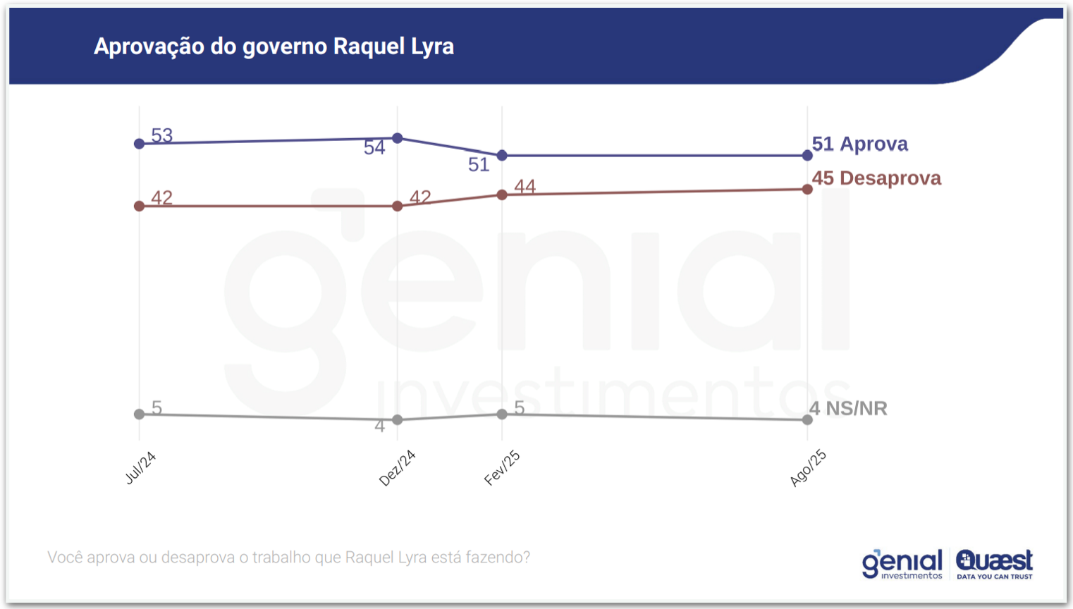 Em relação à avaliação da gestão, 51% aprovam o governo Raquel Lyra, 45% desaprovam e 4% não souberam ou não responderam. O índice de aprovação se mantém estável desde fevereiro, quando também estava em 51%. À época, 44% desaprovavam a gestão.