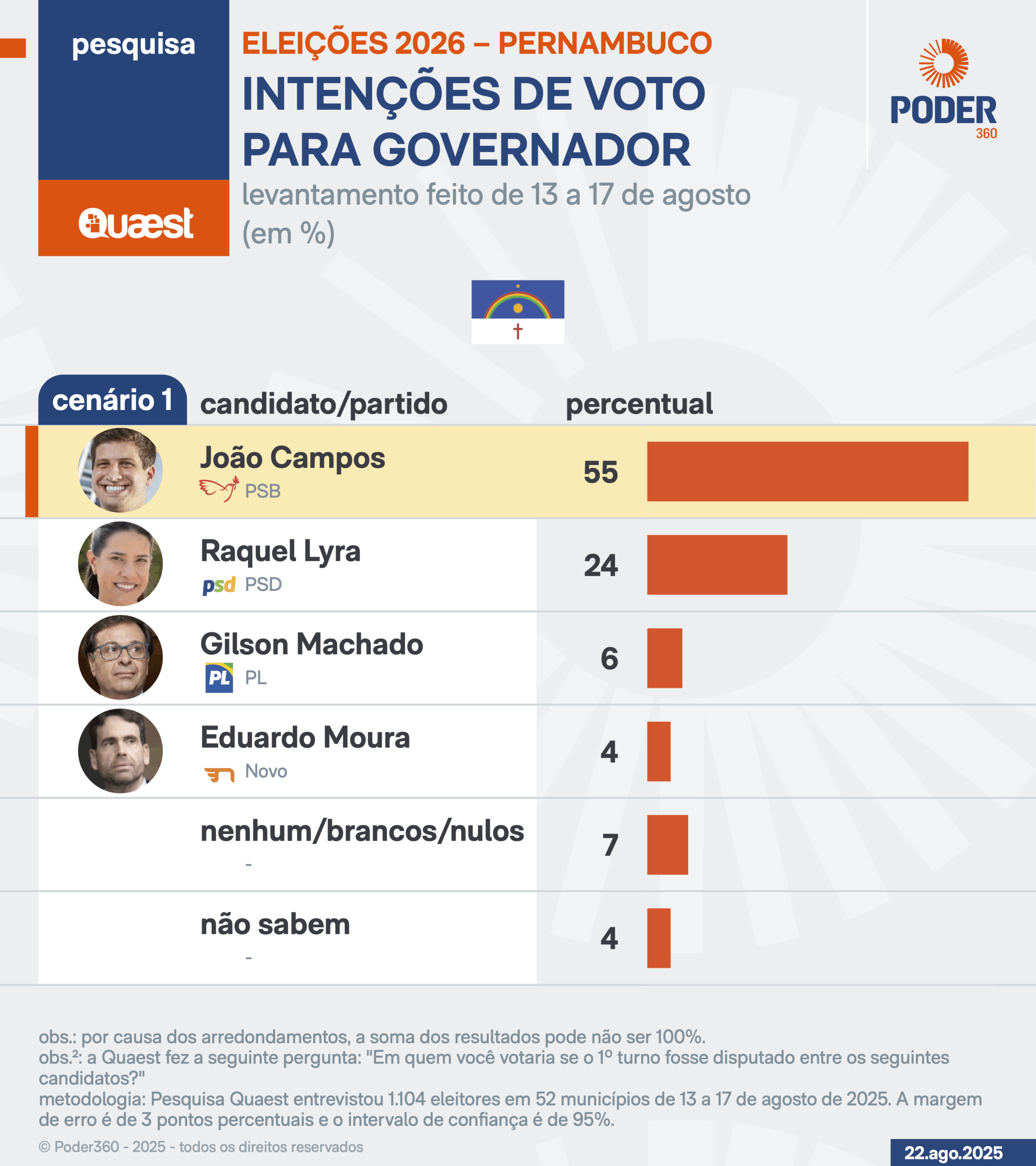 O levantamento foi encomendado pela Genial Investimentos. Foram realizadas 1.104 entrevistas com pessoas de 16 anos ou mais em 52 municípios de Pernambuco, de 13 a 17 de agosto. A margem de erro é de 3 pontos percentuais para mais ou para menos. O nível de confiança é de 95%. Leia a íntegra do estudo (PDF – 8 MB).