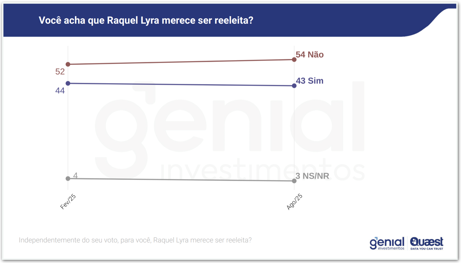 A pesquisa também avaliou a possibilidade de reeleição da governadora. Para 54% dos entrevistados, Raquel Lyra não merece continuar no cargo (eram 52% em fevereiro). Já 43% defendem a reeleição (eram 44% em fevereiro) e 3% não souberam ou não responderam (eram 4%).