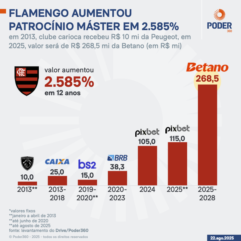 O Flamengo aumentou em 2.585% o valor do contrato de patrocínio máster em 12 anos, segundo levantamento do Poder360. Em 2013, a montadora francesa Peugeot pagava R$ 10 milhões ao clube carioca. A partir de 2025, o acordo fechado com a casa de apostas Betano, na 3ª feira (19.ago.2025), renderá R$ 268,5 milhões anuais.