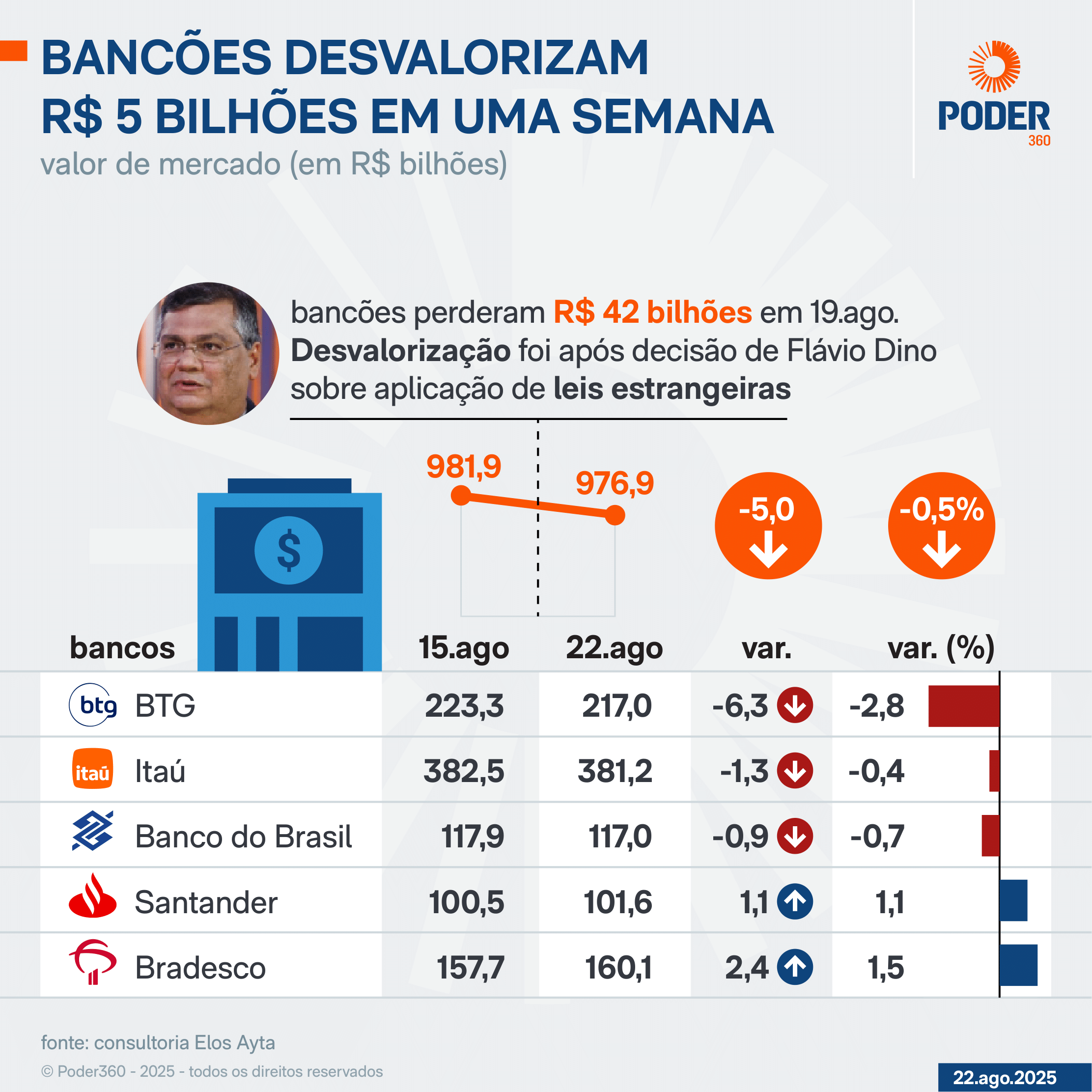 Os 5 bancos tiveram um baque de R$ 42 bilhões na 3ª feira (19.ago) depois de uma determinação do ministro do STF (Supremo Tribunal Federal) Flávio Dino a respeito da aplicação de decisões estrangeiras no Brasil. De acordo com ele, a execução só terá efeito “mediante a devida homologação” da Justiça brasileira.