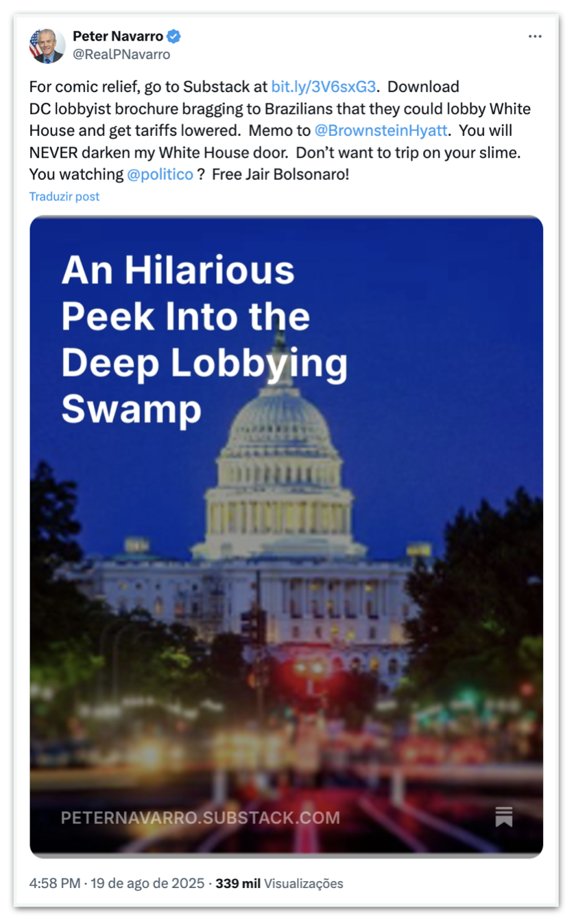 No mesmo dia, ao deixar o link para acesso ao post no Substack em publicação em seu perfil do X, Navarro criticou a empresa de lobby por oferecer serviços a quem enfrenta as tarifas impostas pelo governo Trump.