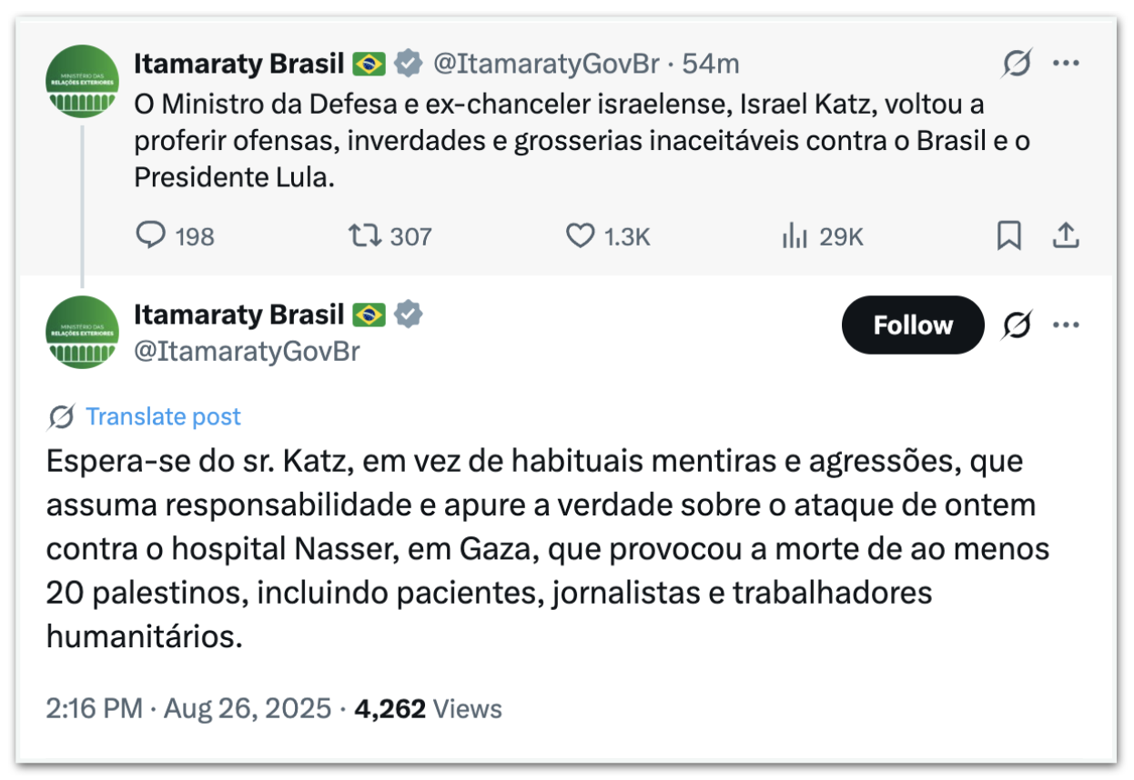 O Ministério das Relações Exteriores brasileiro respondeu à publicação do ministro de Israel e afirmou que as declarações de Katz são “inverdades e grosserias inaceitáveis”.