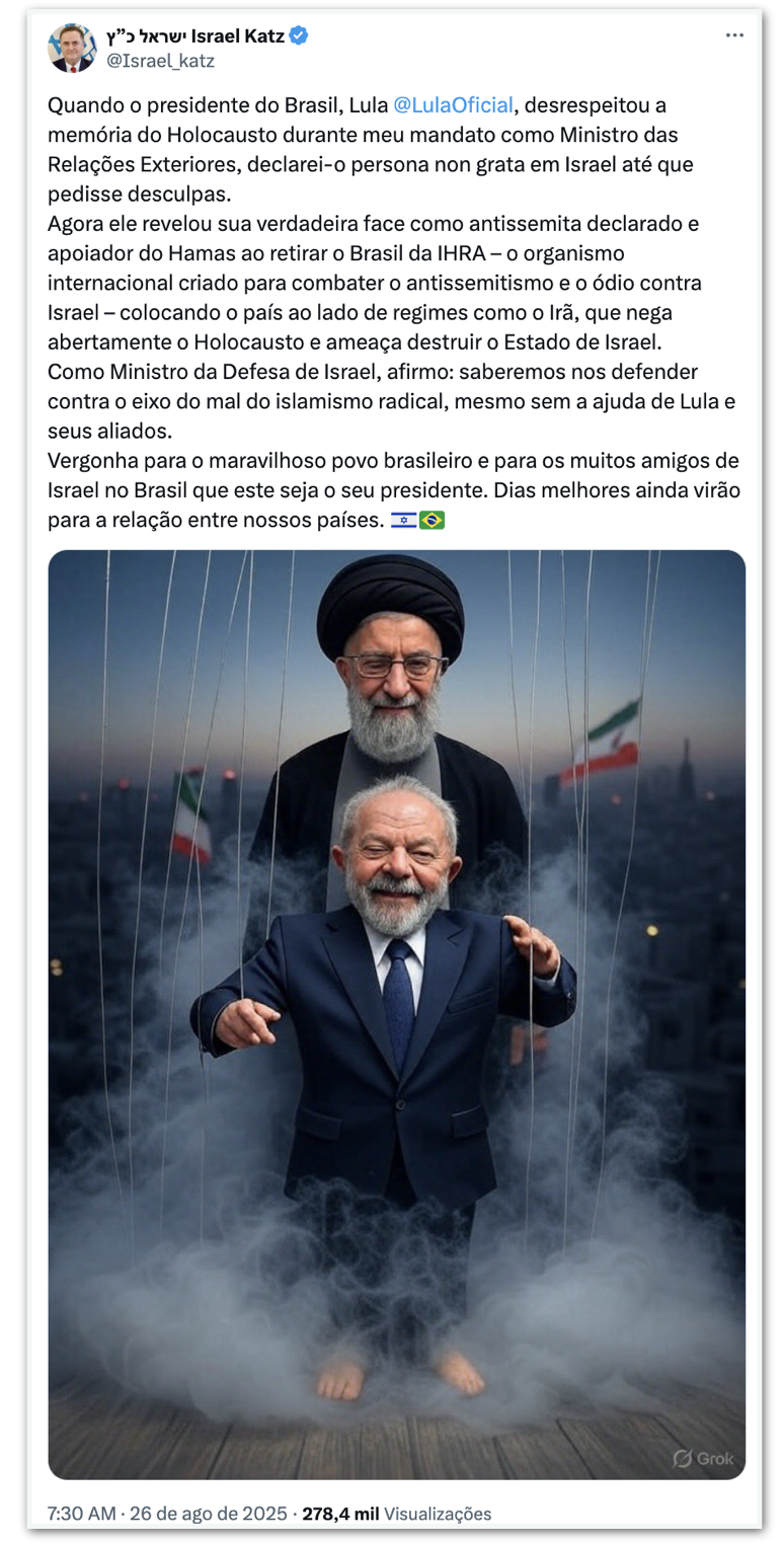 Israel Katz também publicou uma imagem criada por inteligência artificial mostrando Lula como marionete do aiatolá Ali Khamenei, do Irã. O ministro declarou que Israel saberá se defender “mesmo sem a ajuda de Lula e seus aliados”.