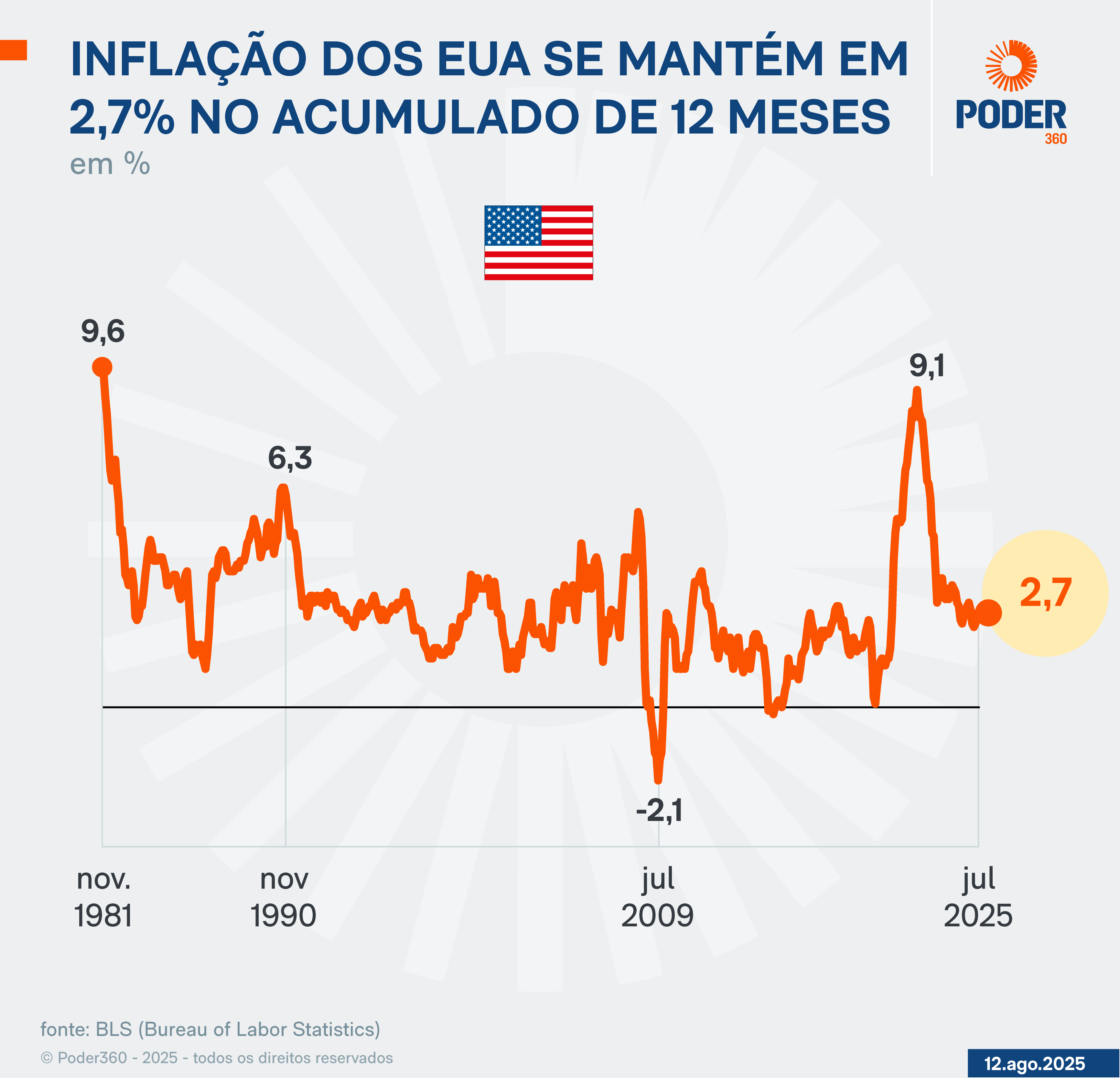 A inflação anualizada dos Estados Unidos foi de 2,7% em julho. A taxa teve uma queda de 0,2 ponto percentual em relação mesmo período de 2024, quando foi de 2,9%. A inflação mensal foi de 0.2%, 0,1 ponto percentual abaixo do registrado no mês anterior (0,3).