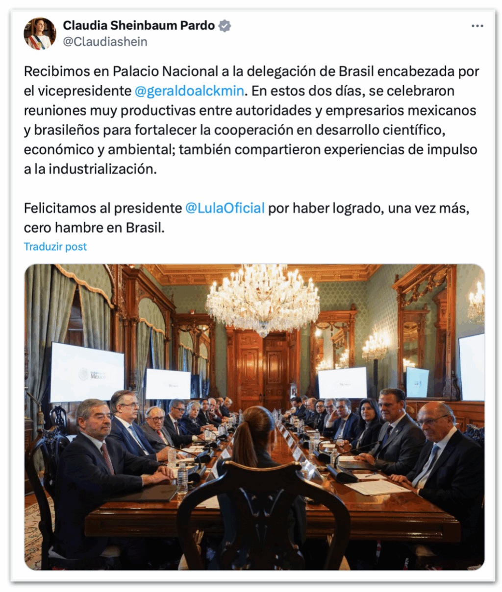 “Nos últimos 2 dias, foram realizadas reuniões muito produtivas entre autoridades mexicanas e brasileiras e líderes empresariais para fortalecer a cooperação em desenvolvimento científico, econômico e ambiental; também compartilharam experiências na promoção da industrialização”, escreveu Sheinbaum.