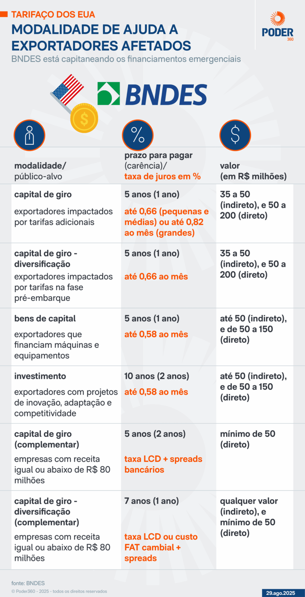 - finalidade: apoiar a necessidade de liquidez de exportadores de bens impactados por tarifas adicionais sobre exportações brasileiras;