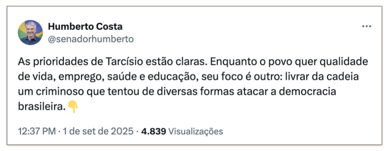 O senador Humberto Costa (PT-PE) declarou que o “foco” do governador é “livrar da cadeia um criminoso que tentou de diversas formas atacar a democracia brasileira”.