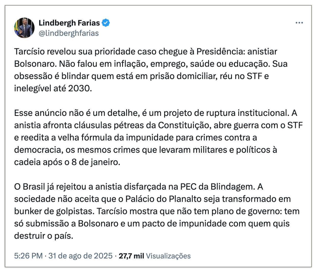 O líder do PT na Câmara, Lindbergh Farias (RJ), disse que a declaração “não é um detalhe, é um projeto de ruptura institucional”. Segundo ele, “Tarcísio mostra que não tem plano de governo: tem só submissão a Bolsonaro e um pacto de impunidade com quem quis destruir o país”.