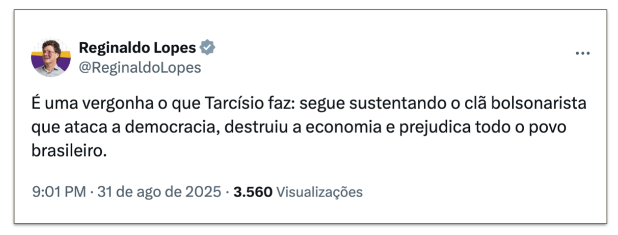 Já o deputado federal Reginaldo Lopes (PT-MG) disse que a fala “é uma vergonha” e que Tarcísio “segue sustentando o clã bolsonarista que ataca a democracia, destruiu a economia e prejudica todo o povo brasileiro”.
