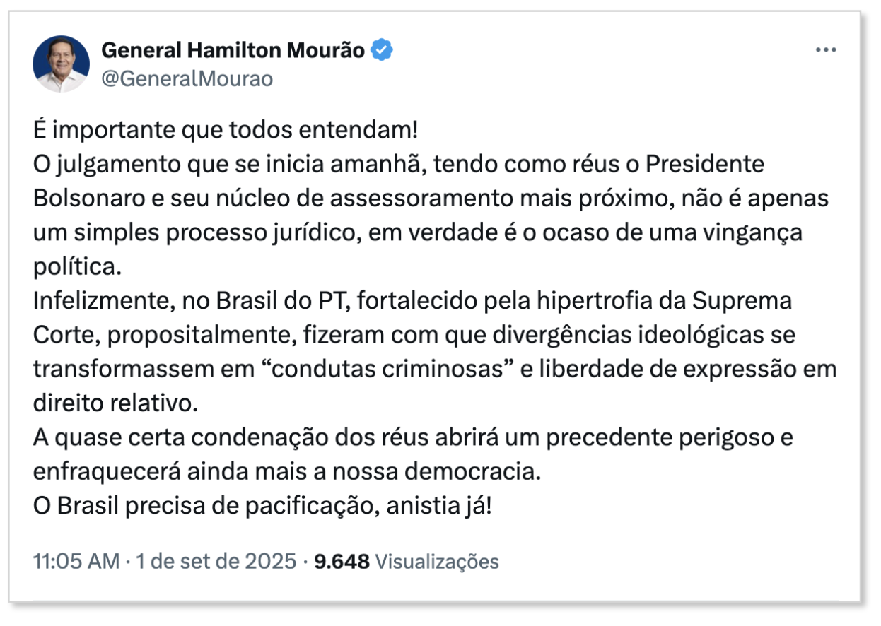 Mourão também afirmou que a “quase certa condenação” de Bolsonaro e de seus aliados abrirá um precedente perigoso e enfraquecerá a democracia. Para ele, o país precisa de pacificação e de uma anistia ampla.