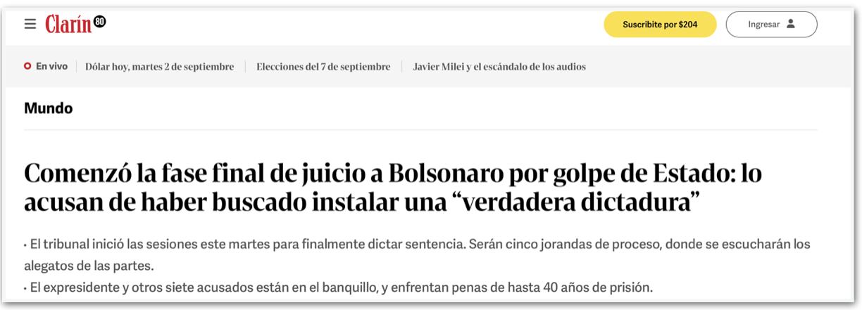 O Clarín diz que o julgamento “teve consequências inesperadas, desencadeando uma crise sem precedentes entre o Brasil e os Estados Unidos.” Destaca ser a 1ª vez que um ex-chefe de Estado brasileiro enfrenta tais acusações, um “evento histórico 40 anos após o fim da ditadura militar (1964-1985), cujos autores nunca foram levados à justiça”. Comenta a segurança reforçada em Brasília e relembra que Lula também esteve preso de 2018 a 2019.