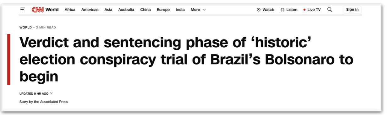 A rede americana CNN republica reportagem da agência de notícias AP (Associated Press). O texto diz que especialistas classificaram o julgamento de Bolsonaro como “histórico”. Cita a ditadura militar, “uma era pela qual Bolsonaro expressou nostalgia.”