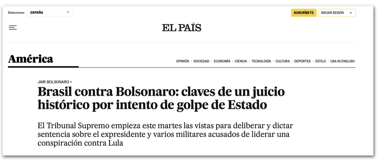 O El País destaca que “nunca um ex-presidente brasileiro ou militares prestaram contas frente à justiça por um golpe. Até agora”. A reportagem do jornal espanhol detalha acontecimentos e provas coletadas. O El País também destaca a pressão internacional exercida pelo presidente americano Donald Trump (Partido Republicano), que classificou o julgamento como “caça às bruxas” e impôs tarifas de 50% sobre produtos brasileiros. Diz ainda que a contagem para o veredicto “acelerou a batalha pela sucessão dentro do clã familiar e da direita”.
