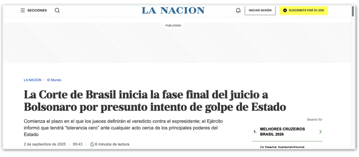 O La Nación relata “clima de máxima expectativa” para os próximos dias de julgamento. O jornal argentino menciona o “emblemático e criticado” Alexandre de Moraes e destaca as medidas de segurança com contingentes da Polícia Militar e Guarda Nacional. “Para o Brasil, que emergiu de duas décadas de ditadura militar em 1985, o alcance do julgamento é considerável”, diz o texto. A reportagem também cita “crise diplomática e comercial sem precedentes com os Estados Unidos”, afirmando que a pressão americana até agora não surtiu efeito.