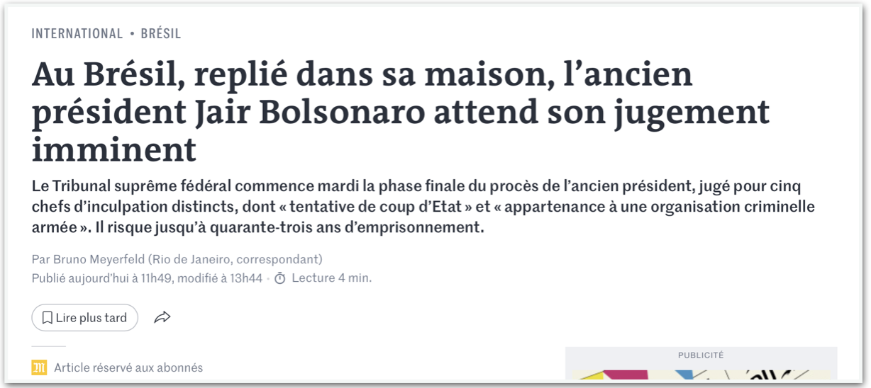 O Le Monde, da França, diz que “chegou a hora de verdade para o Brasil”. Destaca que Bolsonaro permanece “recolhido em casa” enquanto aguarda o “julgamento iminente”, “um ponto de virada decisivo no longo processo de redemocratização do gigante latino-americano”. Afirma que “jamais, na conturbada história política do Brasil, um ex-chefe de Estado havia sido acusado de fatos de tamanha gravidade”.