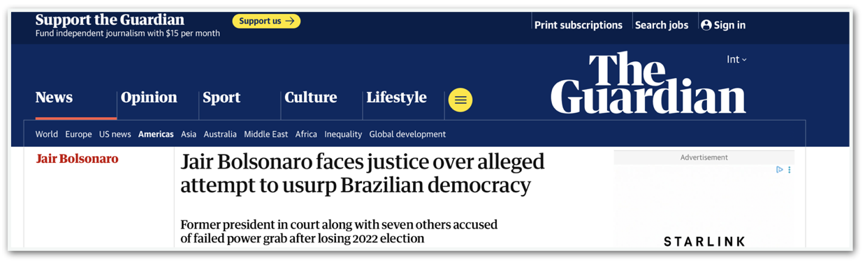 O The Guardian afirma que Bolsonaro “enfrenta justiça por suposta tentativa de usurpar a democracia brasileira”. O jornal britânico escreve que esta é a 1ª vez na história brasileira que figuras tão poderosas enfrentam a Justiça por tentarem derrubar a democracia do país. Destaca que o Brasil “sofreu mais de uma dúzia de tentativas de golpe de Estado” e que Trump “tentou sabotar os procedimentos com o que analistas chamaram de uma campanha de pressão sem precedentes, que abalou as relações entre EUA e Brasil”. Afirma que o apoio a Lula “parece estar aumentando, com o presidente brasileiro usando a ofensiva de Trump para se posicionar como um patriota defensor dos interesses brasileiros de um ataque estrangeiro”.