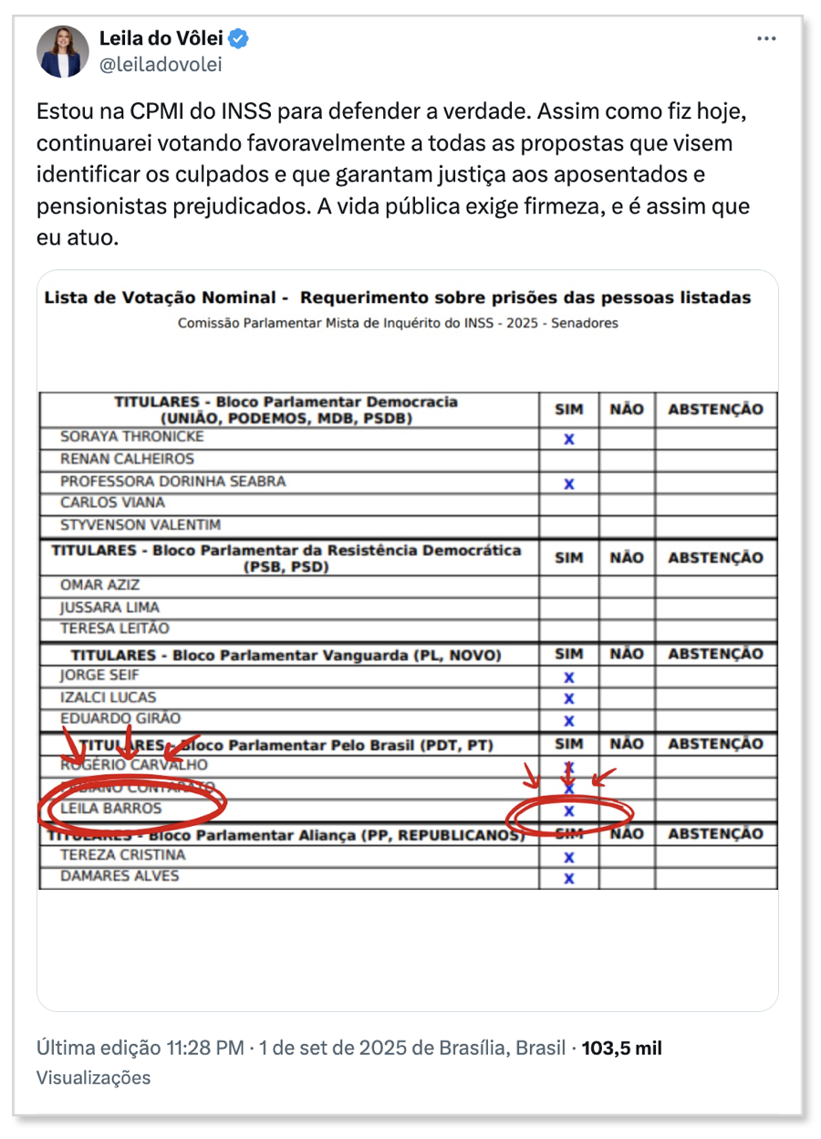 Em seu perfil no X, Leila afirmou que está na CPMI para “defender a verdade”. Completou declarando que a “vida pública exige firmeza, e é assim que eu atuo”.