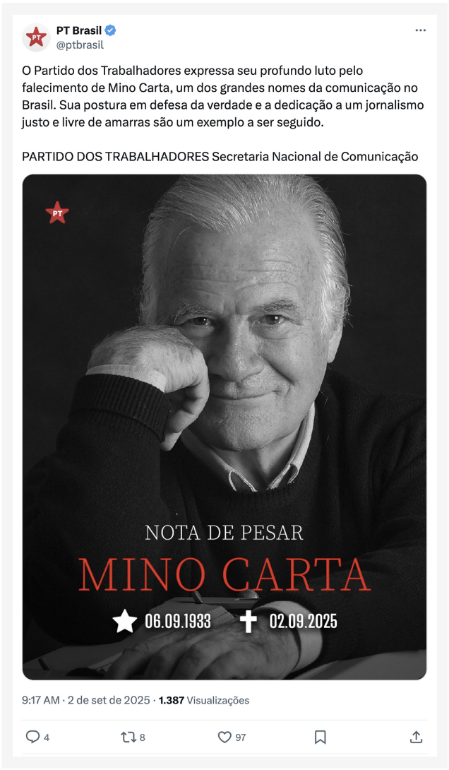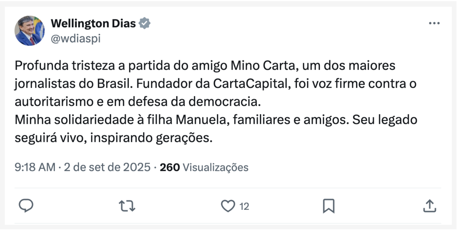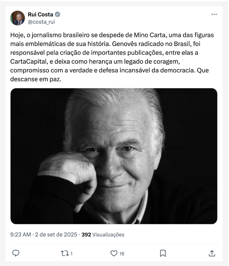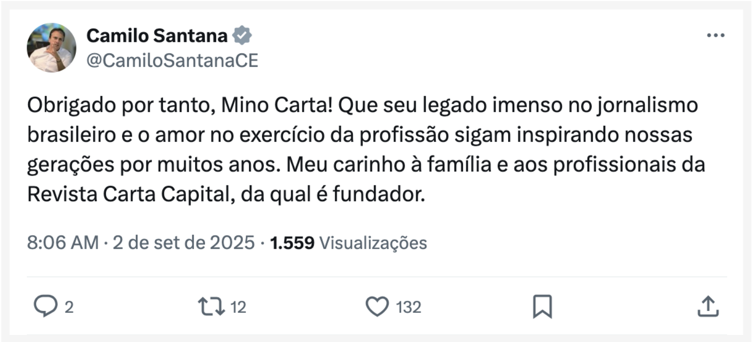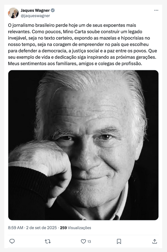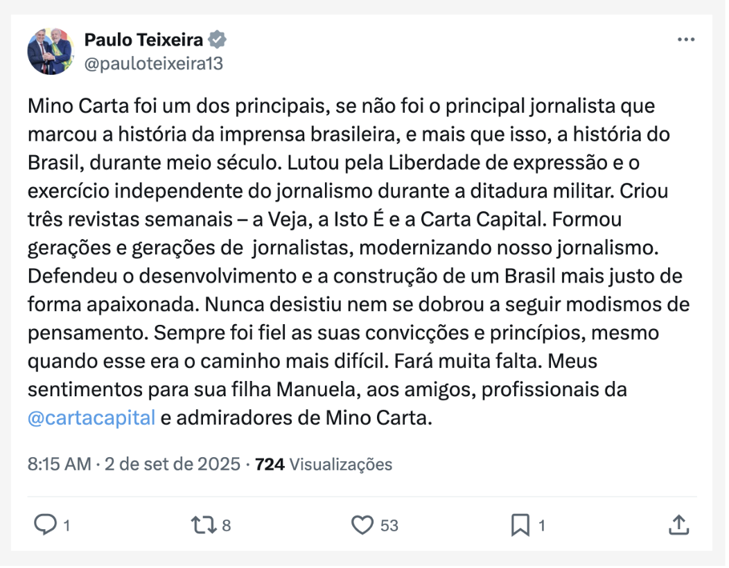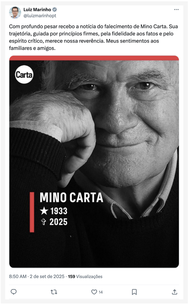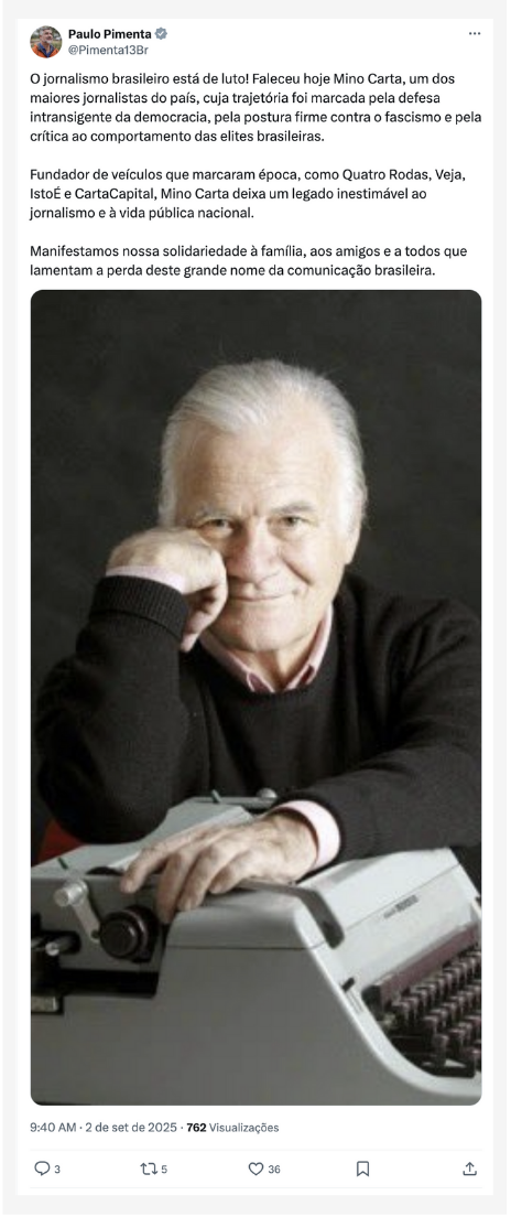 “Estas décadas de convivência me dão a certeza de que Mino foi –e sempre será– uma referência para o jornalismo brasileiro por sua coragem, espírito crítico e compromisso com um país justo e igualitário para todos os brasileiros e brasileiras”, acrescentou.