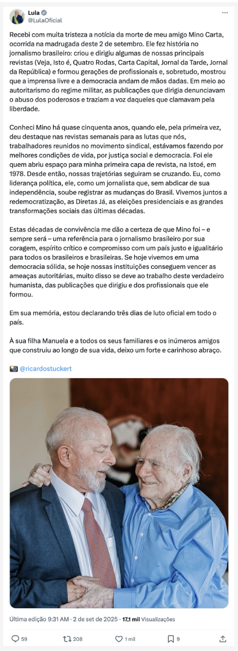 “Conheci Mino há quase 50 anos, quando ele, pela 1ª vez, deu destaque nas revistas semanais para as lutas que nós, trabalhadores reunidos no movimento sindical, estávamos fazendo por melhores condições de vida, por justiça social e democracia”, escreveu o petista.