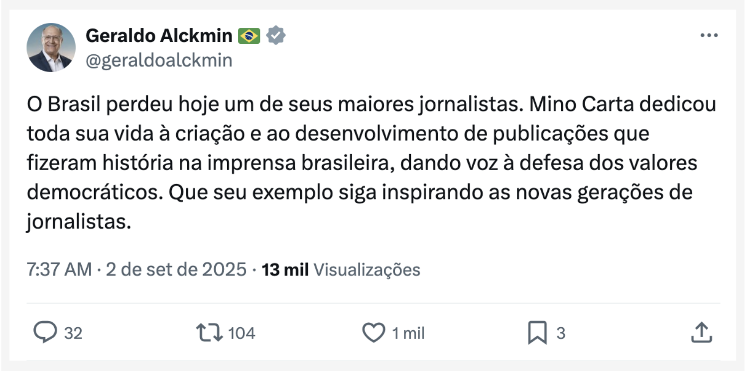O vice-presidente e ministro da Indústria e Comércio, Geraldo Alckmin (PSB), também se manifestou a respeito da morte do jornalista. Em seu perfil no X, ele afirmou que “o Brasil perdeu hoje um de seus maiores jornalistas”.