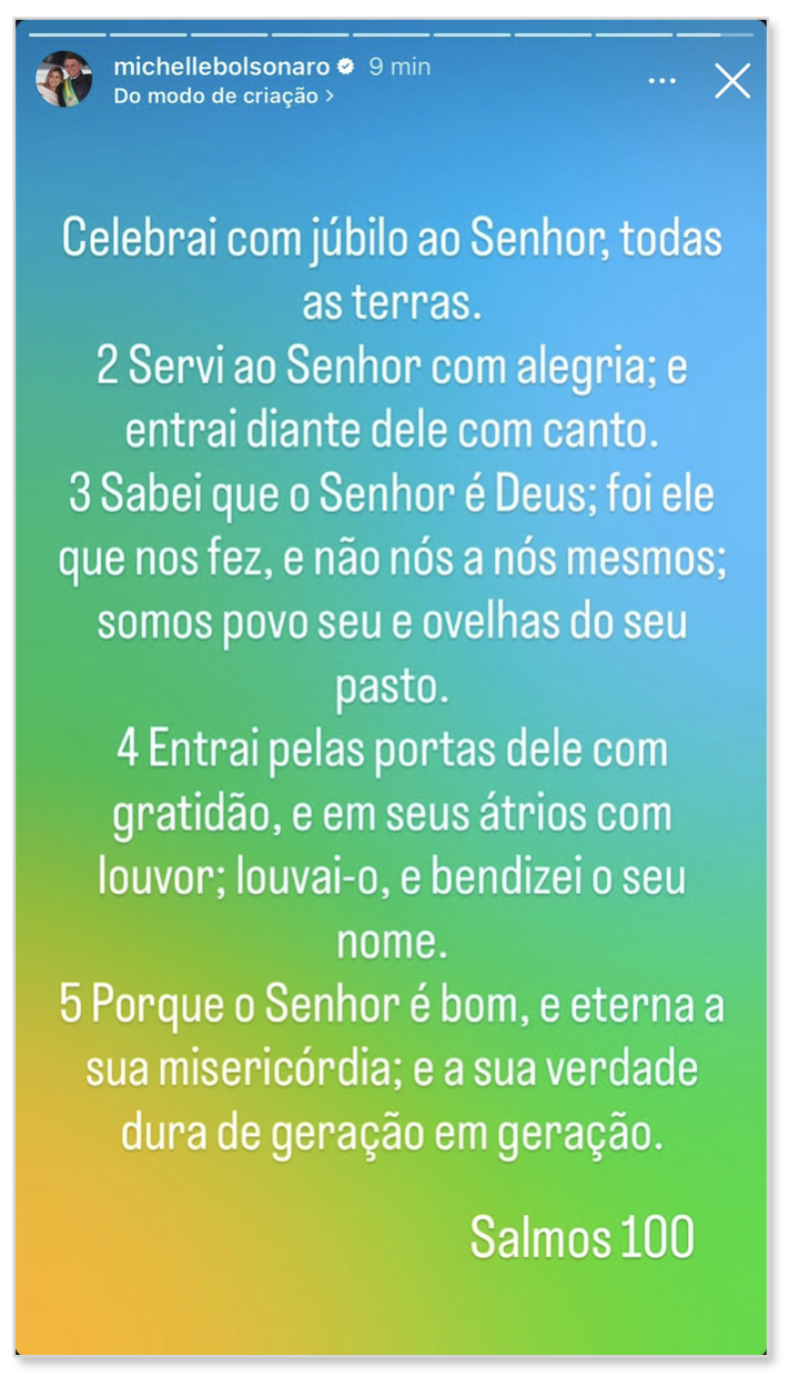 “Entrai pelas portas dele com gratidão, e em seus átrios com louvor; louvai-o, e bendizei o seu nome. Porque o Senhor é bom, e eterna a sua misericórdia; e a sua verdade dura de geração em geração”, diz o Salmo 100 compartilhado por Michelle.