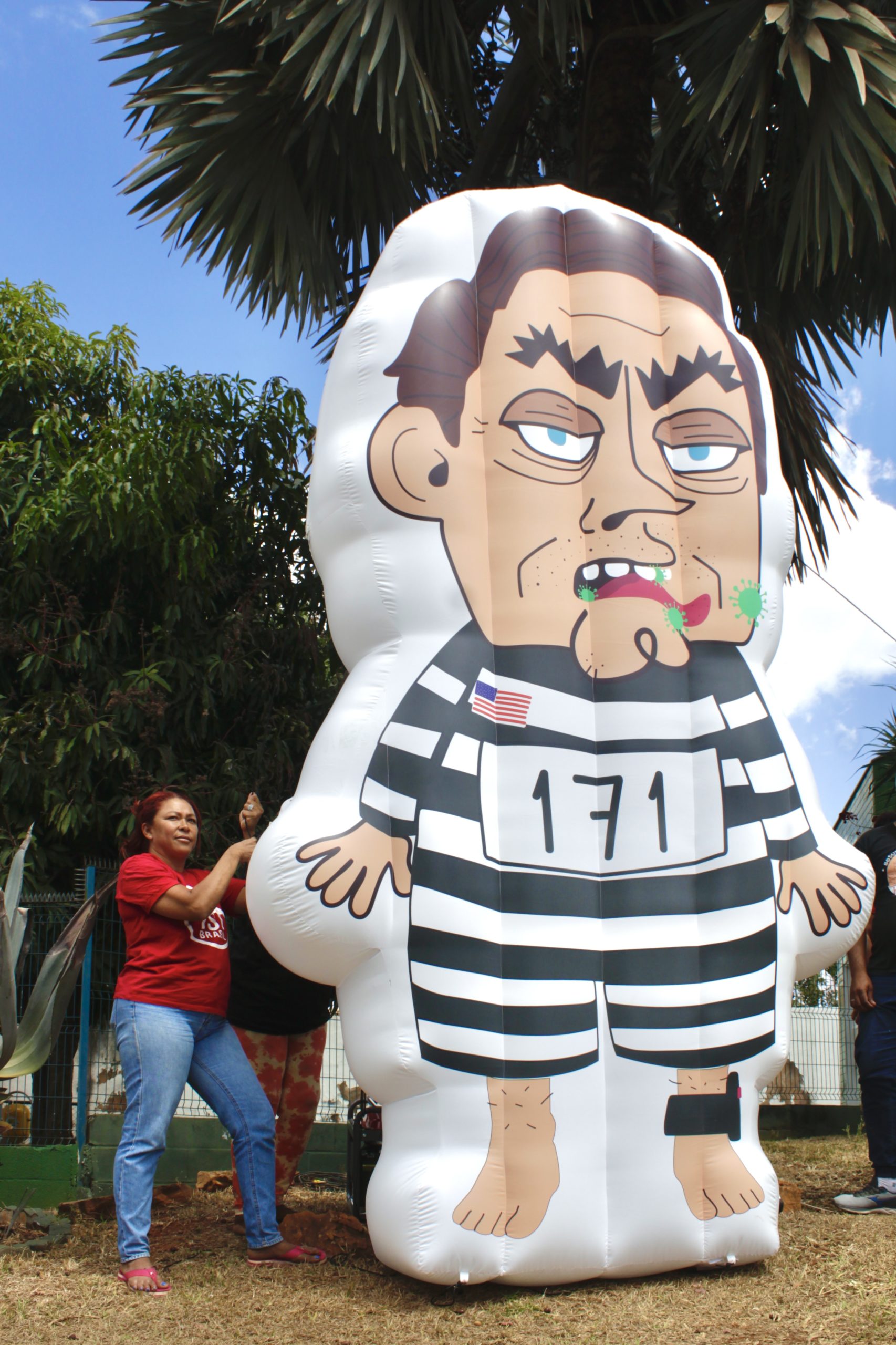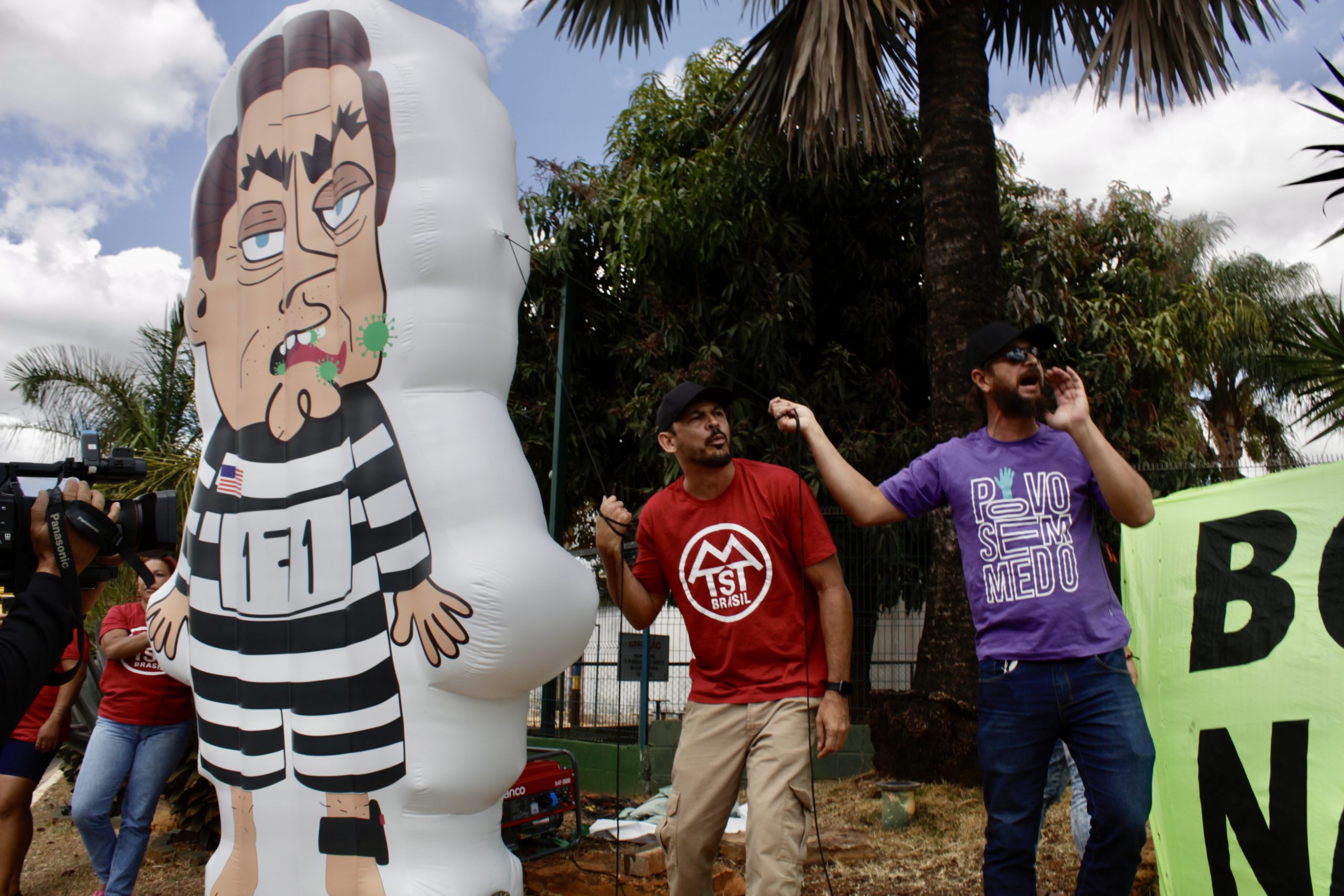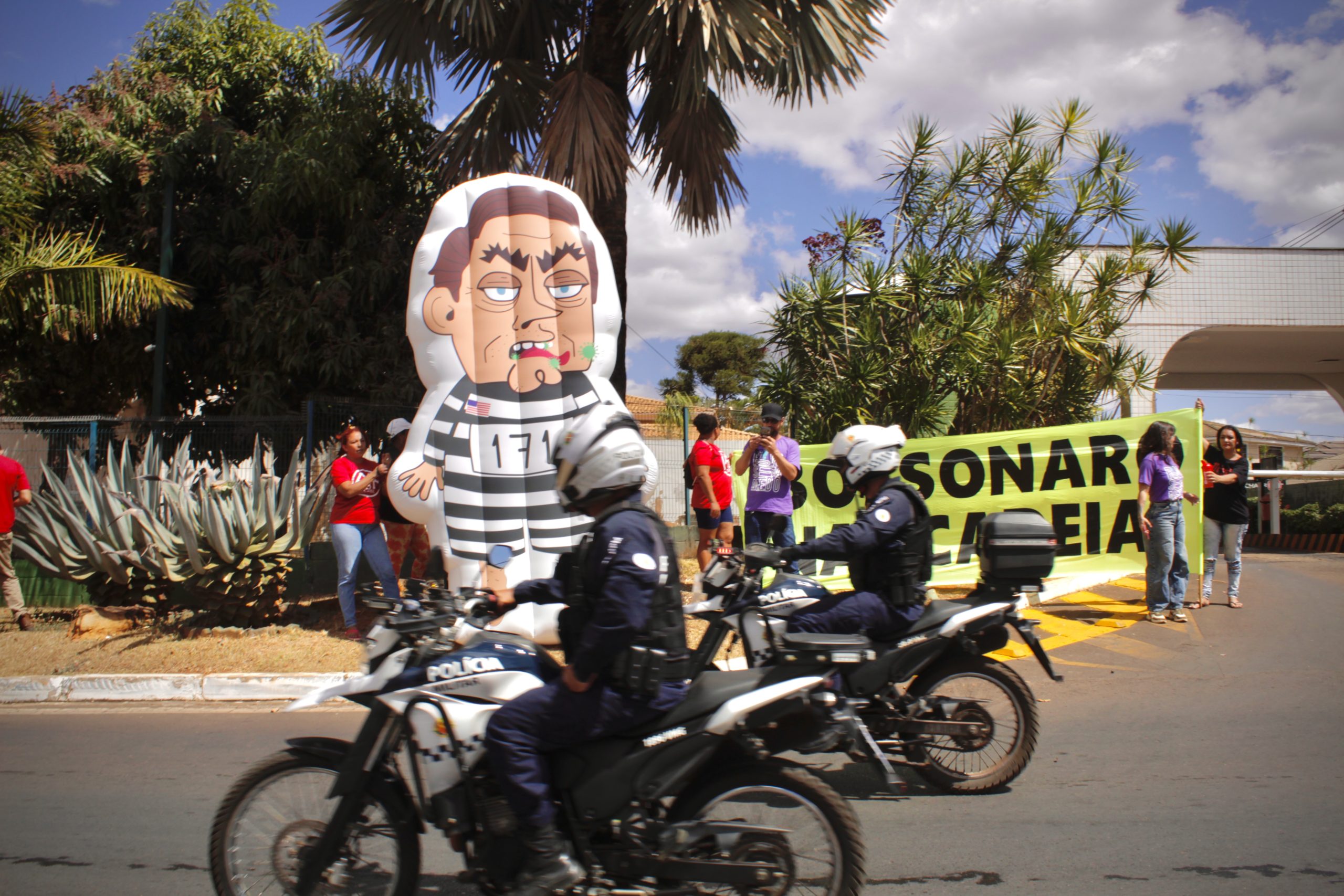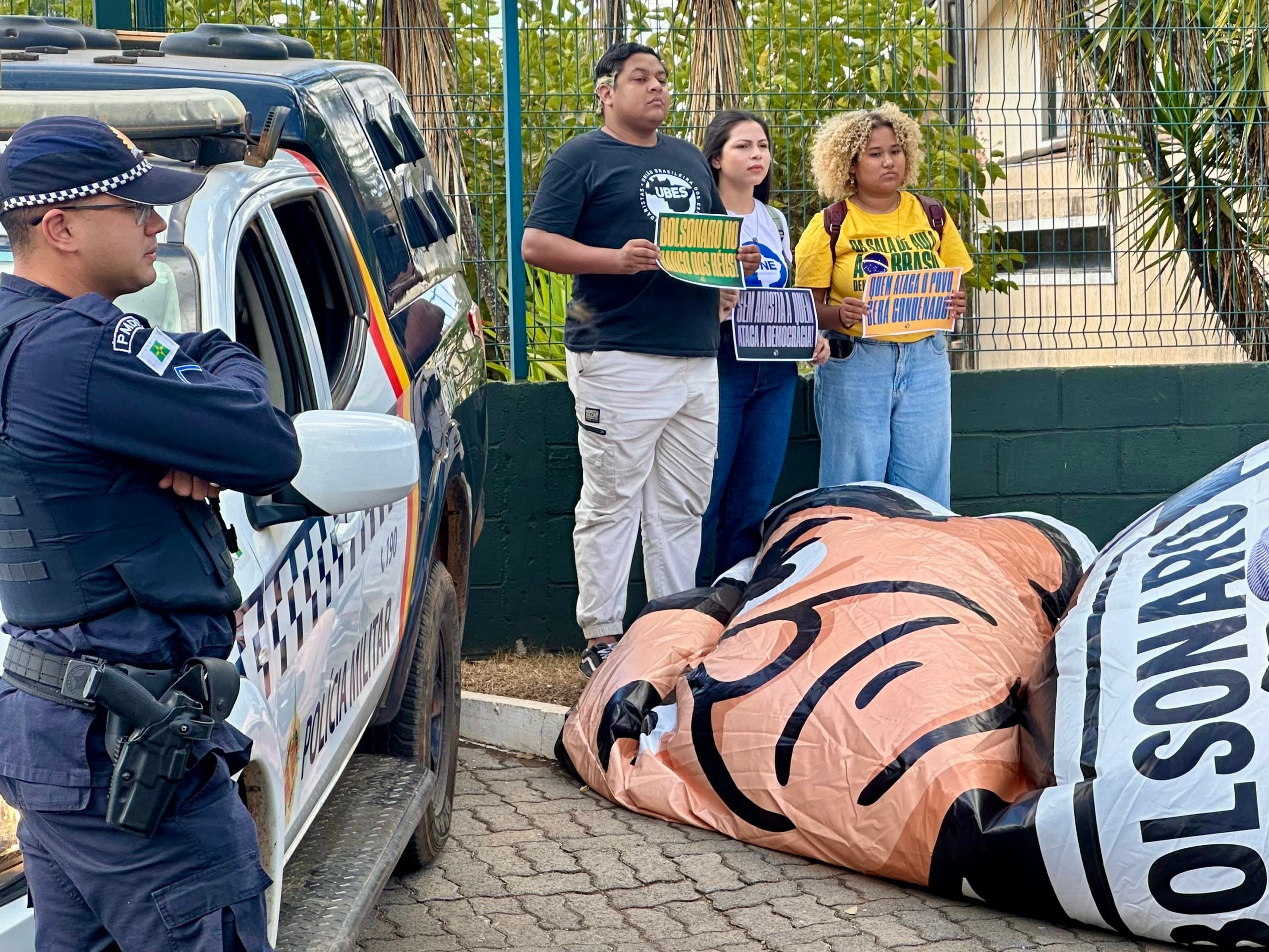 Os manifestantes inflaram um boneco de Bolsonaro usando tornozeleira eletrônica e roupa de presidiário escrito “171” (crime de estelionato). Eles também exibiram um cartaz com a frase “Bolsonaro na cadeia”. O antigo chefe do Executivo cumpre prisão domiciliar em Brasília.