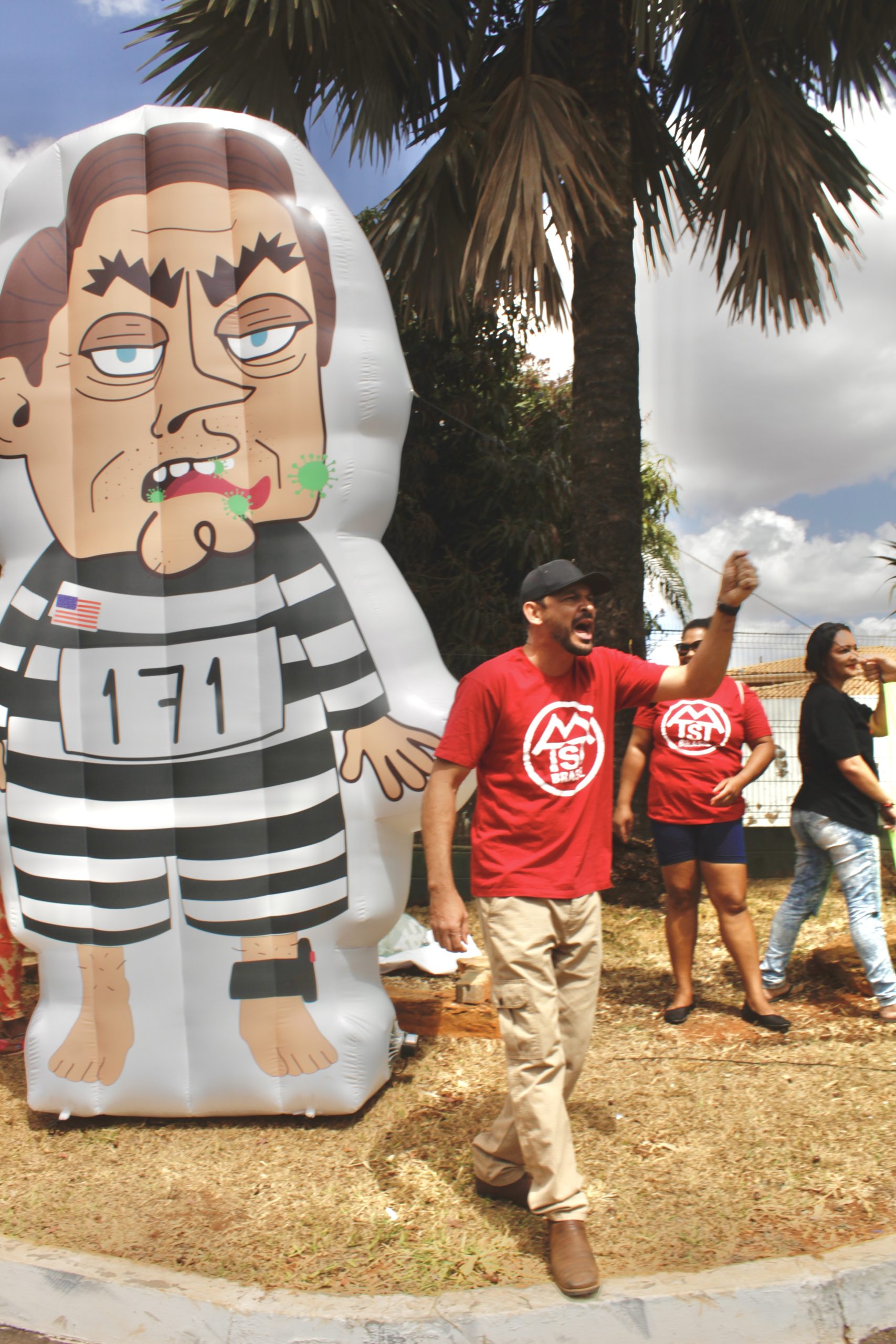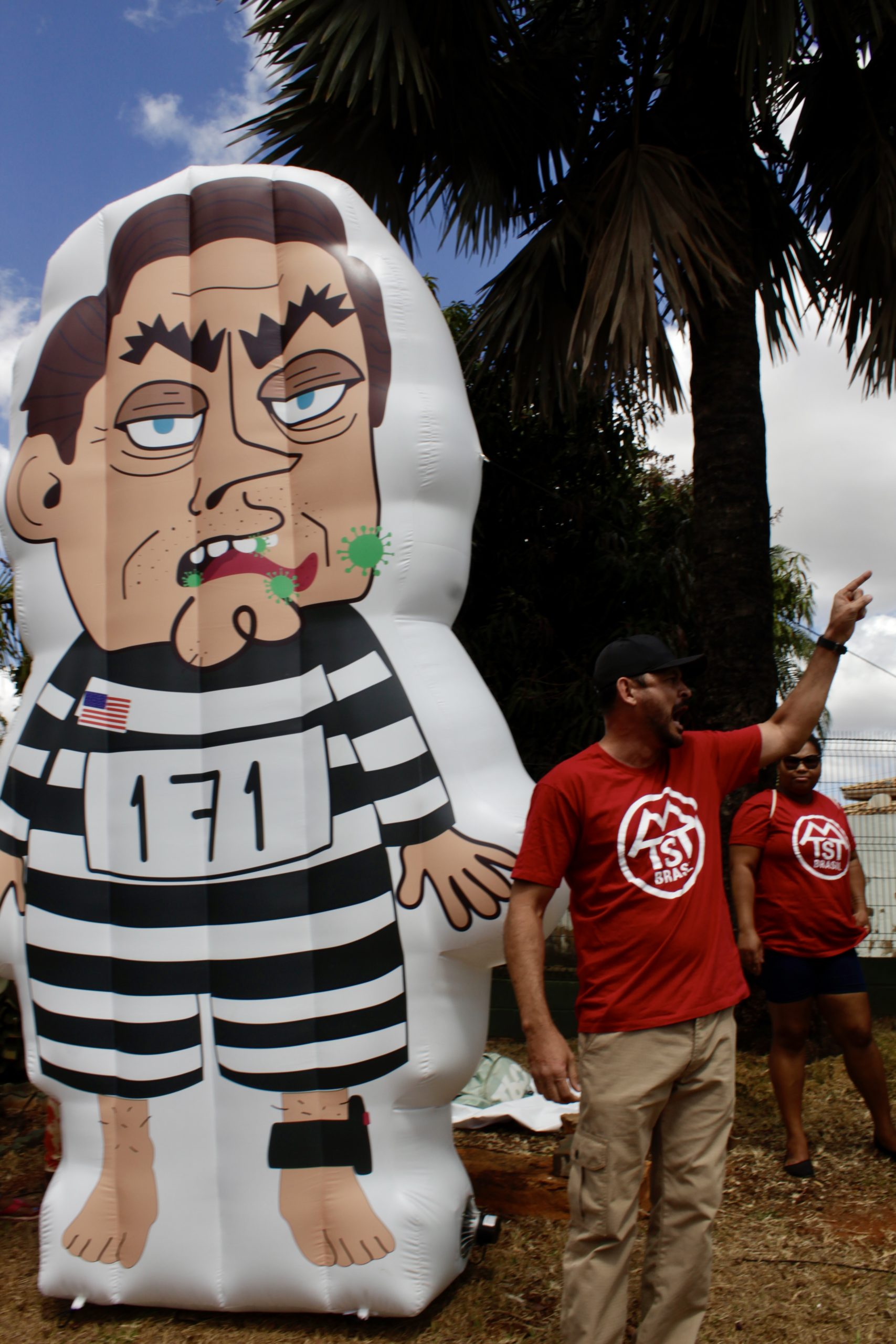 Manifestante do MTST ao lado de boneco inflável de Bolsonaro com roupas de preso