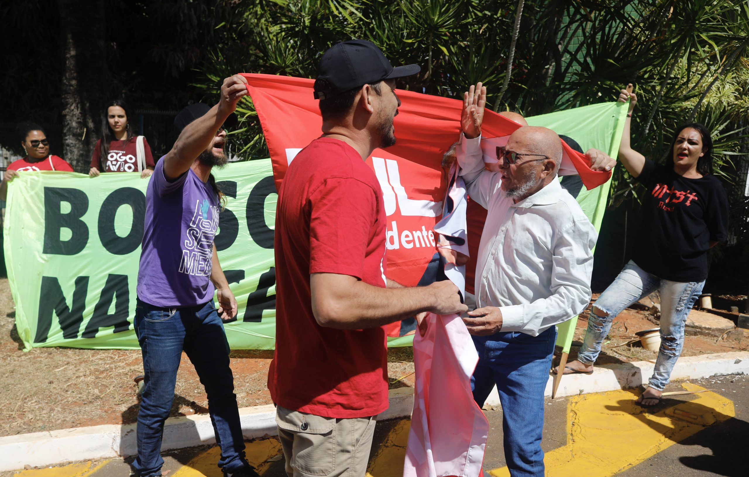 Apoiadores e críticos de Bolsonaro discutiram em frente ao condomínio. A confusão começou quando um morador com camiseta do Fluminense tentou rasgar uma faixa do MTST. Houve troca de empurrões e xingamentos. A Polícia Militar já estava no local e conteve o desentendimento.