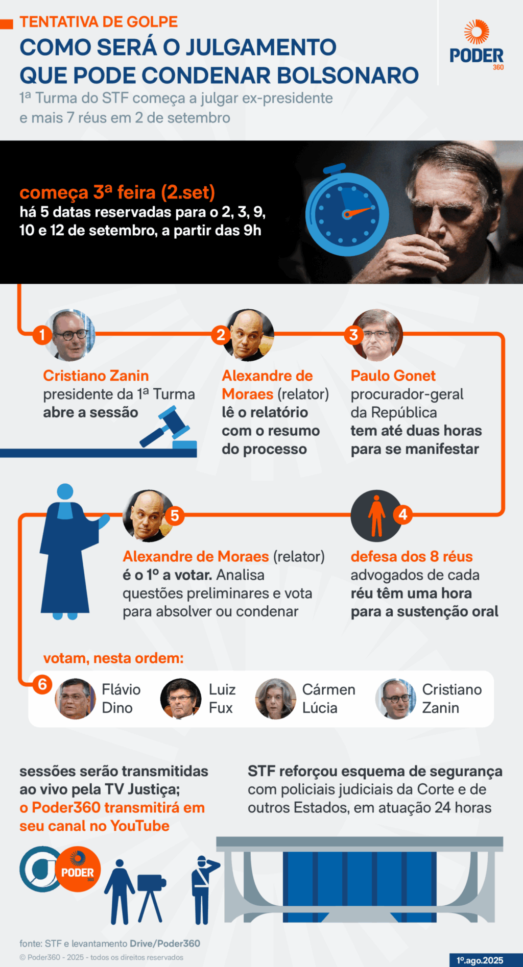 A 1ª Turma do STF julga o ex-presidente Jair Bolsonaro (PL) e mais 7 réus por tentativa de golpe de Estado. A análise do caso pode se alongar até 12 de setembro.