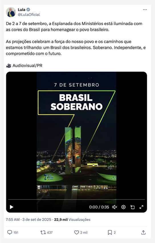 O presidente Luiz Inácio Lula da Silva (PT) publicou, em seu perfil no X, um vídeo com o anúncio de projeções feitas na Esplanada dos Ministérios, em Brasília, em celebração ao 7 de setembro. “As projeções celebram a força do nosso povo e os caminhos que estamos trilhando”, escreveu nesta 4ª feira (3.set.2025).