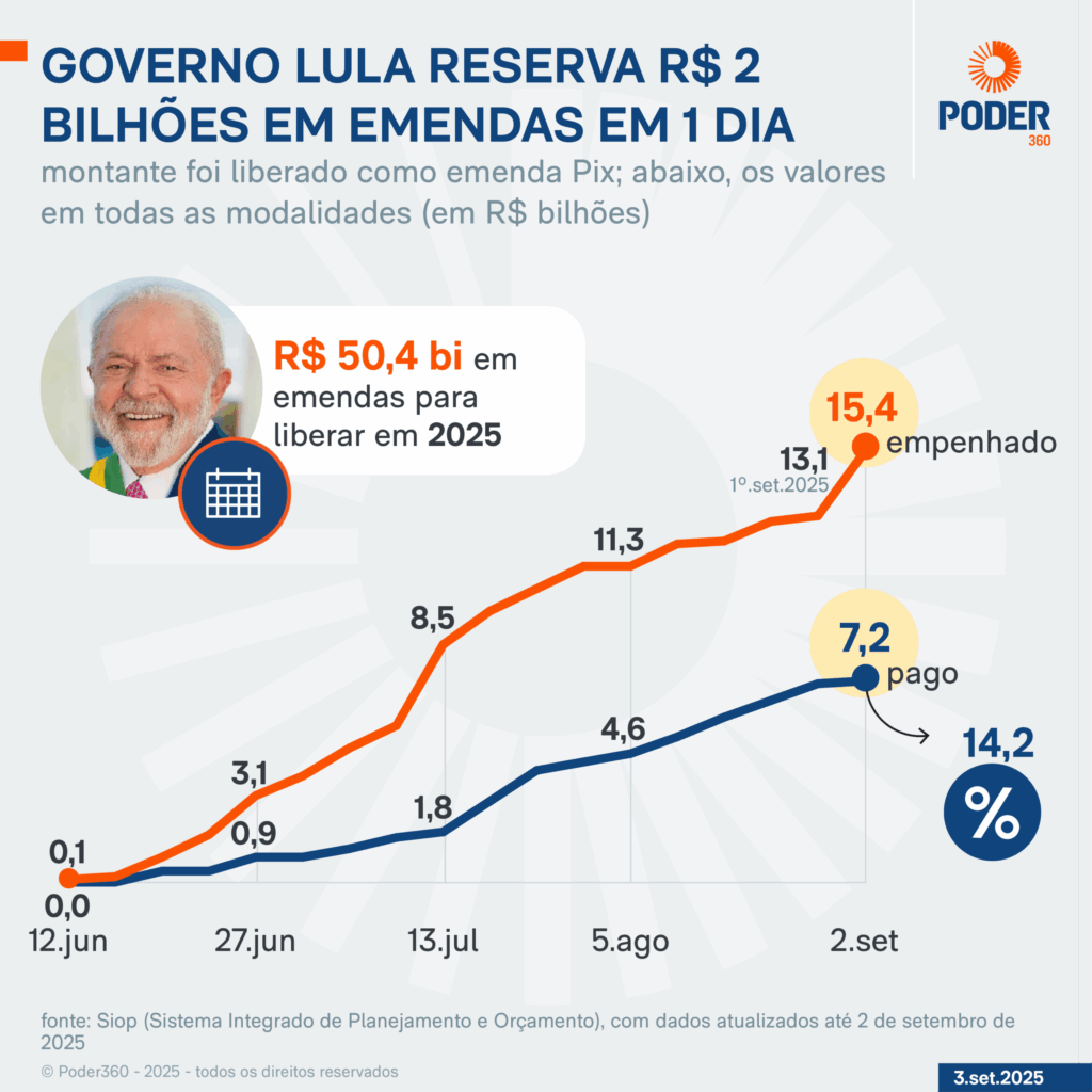 Até 3ª feira (2.set), haviam sido reservados ao todo R$ 15,4 bilhões (de R$ 50,4 bilhões que deverão ser empenhados no ano) –considerando as emendas tradicionais e Pix. O pagamento em si do dinheiro (quando os valores saem do caixa da União) é menor do que isso: só 14,2% do total para 2025 –R$ 7,2 bilhões.