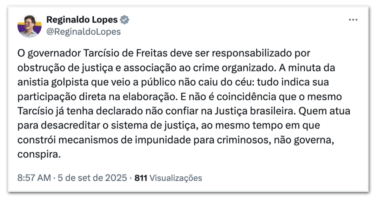 O petista classifica a conduta como possível crime de obstrução de justiça, já que o objetivo de Tarcísio seria uma “interferência direta no exercício do Poder Judiciário” por meio da tramitação da anistia.