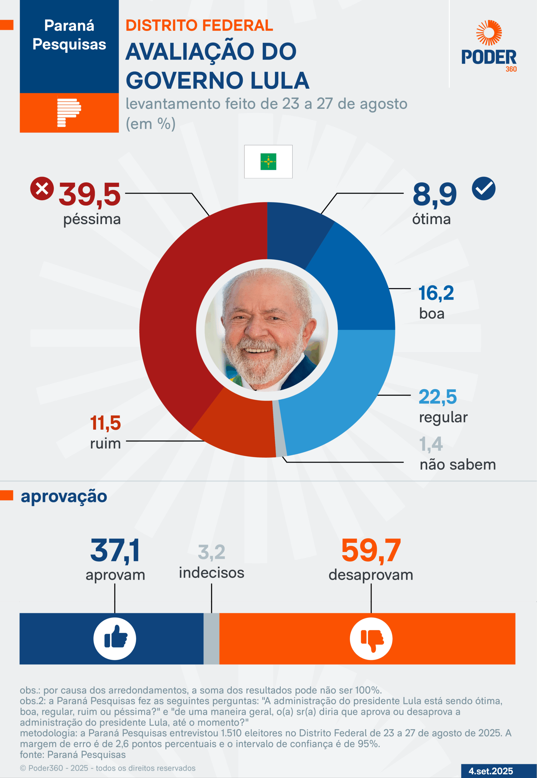 A Paraná Pesquisas entrevistou presencialmente 1.510 eleitores do Distrito Federal de 23 a 27 de agosto. A margem de erro é de 2,6 pontos percentuais, para mais ou para menos, e nível de confiança de 95%.