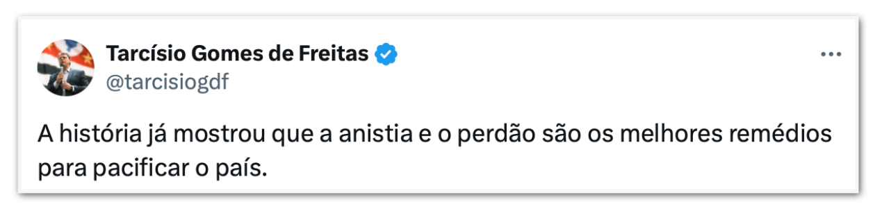 Na legenda da postagem, ele escreveu: “A história já mostrou que a anistia e o perdão são os melhores remédios para pacificar o país”.