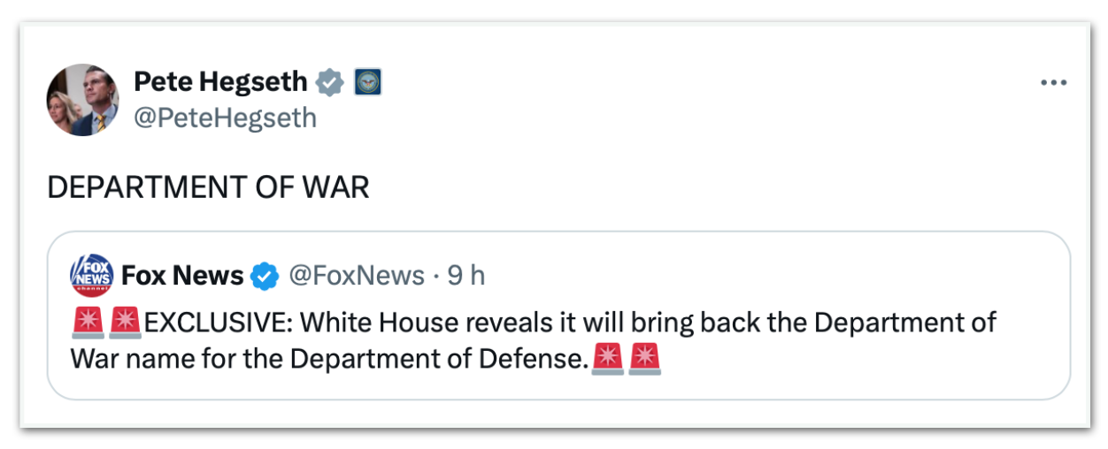 O secretário de Defesa, Pete Hegseth, compartilhou em seu perfil no X o anúncio da reportagem da Fox News, escrevendo, em letras garrafais: “Departamento de Guerra”.