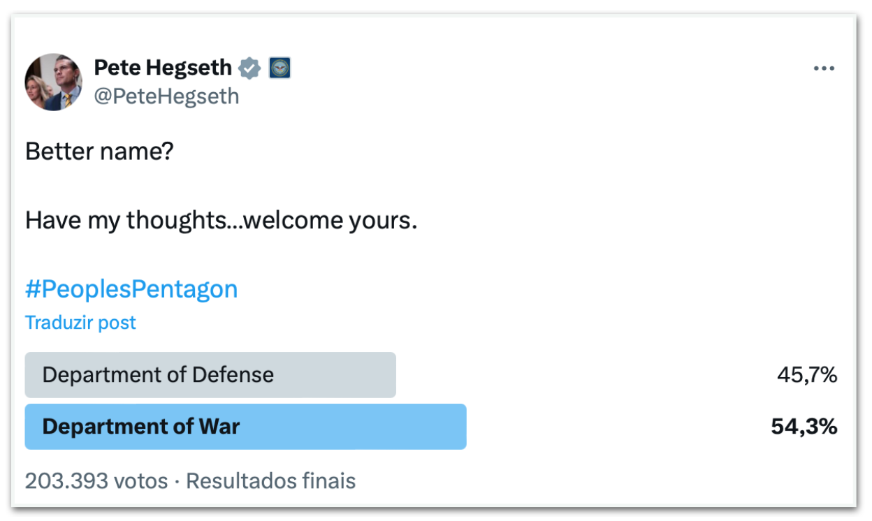 Hegseth tem defendido a mudança de nome. Na 4ª feira (3.set.2025), ele disse ao programa “Fox & Friends”: “Vencemos a 1ª Guerra Mundial e a 2ª Guerra Mundial não com o Departamento de Defesa, mas com o Departamento de Guerra”. Em março, o secretário realizou uma enquete na rede social X sobre a alteração.