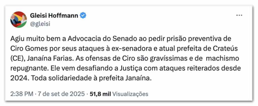 “Agiu muito bem a Advocacia do Senado ao pedir prisão preventiva de Ciro Gomes por seus ataques à ex-senadora e atual prefeita de Crateús (CE), Janaína Farias. As ofensas de Ciro são gravíssimas e de machismo repugnante. Ele vem desafiando a Justiça com ataques reiterados desde 2024. Toda solidariedade à prefeita Janaína”, escreveu Gleisi em seu perfil no X (antigo Twitter).